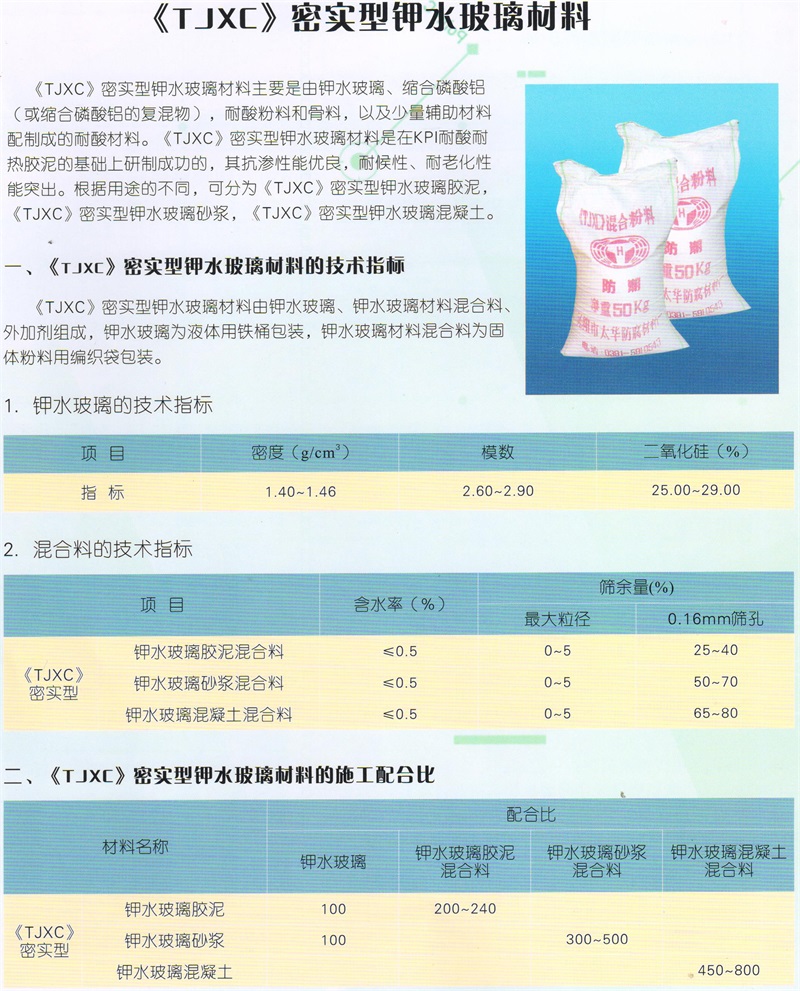 技術(shù)性能特點及用途: 《KPI》耐酸耐熱膠泥是以硅酸鉀為粘結(jié)劑,高分子縮合磷酸鹽為固化劑,硅鋁酸鹽為耐腐蝕填料組成的新型無機(jī)黏合劑。它與以硅酸納為黏合劑,氟硅酸納為固化劑的普通水玻璃膠泥相比,抗?jié)B透性,耐熱性,耐水性等方面顯示出突出的優(yōu)點。